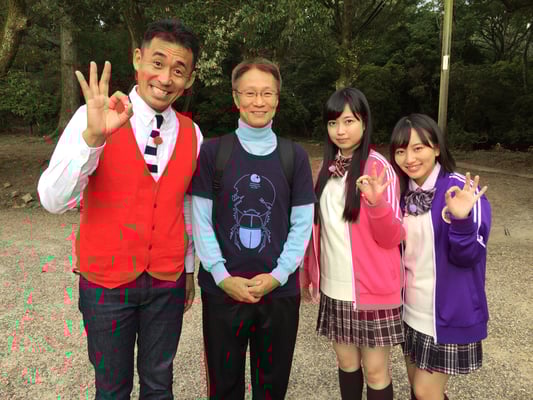 吉本のお笑いタレント石田靖さんとアイドル歌手「たこやきレインボー」の堀くるみさん、彩木咲良さんがご来館 。 館内のご案内&奈良公園で糞虫観察