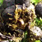 近年、本州では激減しているらしいのですが、奈良公園では春になると毎年大発生していて、芝生にある大きな糞塊にはこいつが10匹以上ひしめきあっていることも珍しくありません。春先に活動を始めるこのマグソコガネは、春のうちに交尾して産卵、幼虫はどんどん大きくなって土中で蛹になり、まだ春が終わらないうちに羽化して新成虫になります。しかし、新成虫はほとんど動かずにそのままじっと夏・秋・冬を過ごし、翌年の春になってようやく元気に動き出します。気温や日照時間の似ている秋に活動しそうなものですが、秋に掘り出して無理に起こそうとしても、寝ぼけたようにゆっくり脚を動かすだけで、まともに歩ける個体は1匹もいませんでしたした。