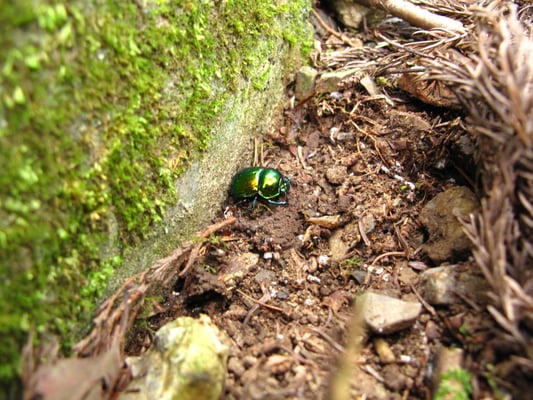 奈良公園のオオセンチコガネは濃い青色なので、一般に”ルリセンチコガネ”と呼ばれています。奈良県南部の吉野でも同様で、美しい”ルリセンチコガネ”は奈良県全域の地域資源と言えそうです。まあ、虫に県境はないので、三重県の鈴鹿の山にもルリセンチコガネがいるようですが、恐らく奈良県出身に違いないと私は考えています。下の写真の美しい”ミドリセンチコガネ”は『土壌動物の世界』等の著者でありミミズをはじめとする土壌動物研究で有名な渡辺弘之先生率いる観察会で見つけた、私にとっては特別な1匹です。